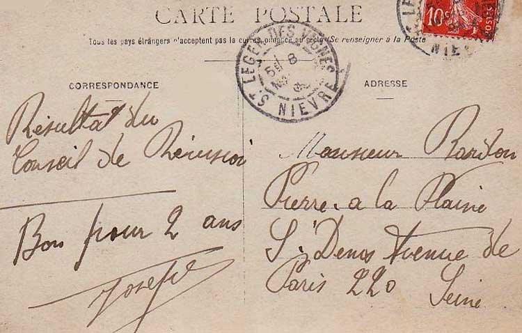 Un certain Joseph écrit à Monsieur BARDOU (ou BARDON) Pierre à la Plaine-Saint-Denis pour lui faire savoir qu'à la suite du conseil de révision, il est "bon pour deux ans"...
